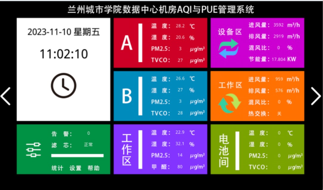 校本部数据中心机房于2023年8月完成迁址扩建,占地面约400平方米。在建设中积极响应落实党中央、国务院关于碳达峰、碳中和的战略决策部署,以安全、绿色、高效、智能为设计理念,从技术创新、空间结构、设备选型、运行机制等多个方面优化能效管理,引入了自研的AQPEM系统(Air Quality and Power Efficiency Management),实现了PUE低于国家中小型数据中心机房引导值。该系统是AQI与PUE指数的综合管理系统,结合新风系统、可管控风管系统、AQPEM智能控制软件等软硬件,充分发挥本地区的自然条件,将室外低温空气经过净化、温湿度调控后引入机房,从而降低机房制冷量需求,系统地实现对机房空气质量与PUE的优化调控,目前机房的即时PUE最低可达到1.38(国家引导值1.5)。