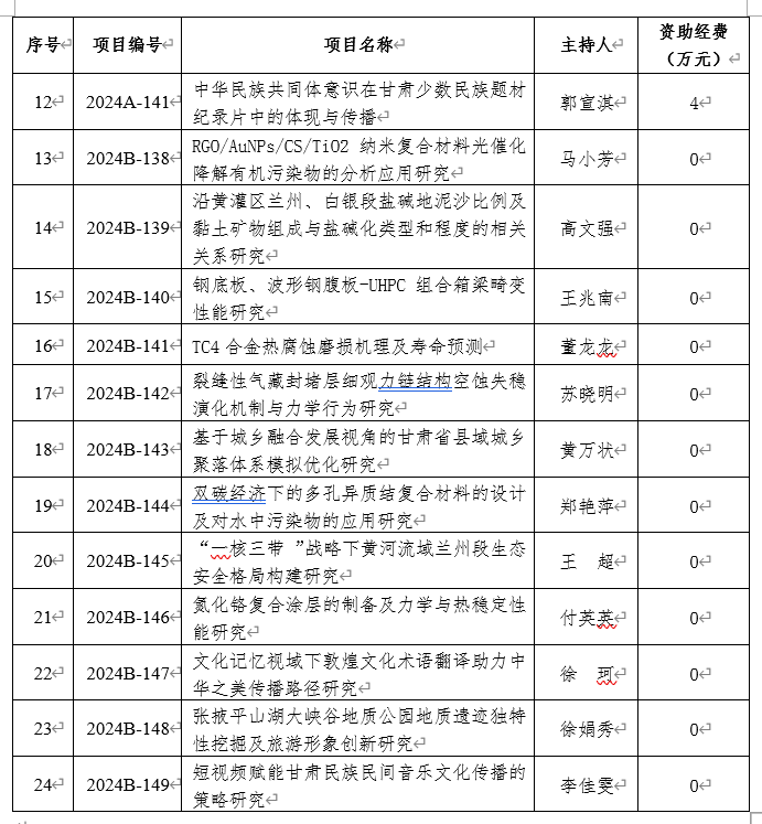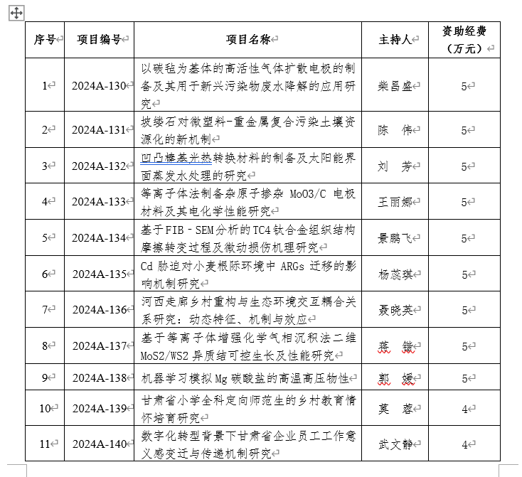 近日,2024年度甘肃省教育厅高校教师创新基金项目立项结果公布,beat365共有24项课题获准立项,其中,资助经费项目12项,自筹经费项目12项。自然科学类每项资助5万元,人文社科类每项资助4万元,资助总经费达57万元。