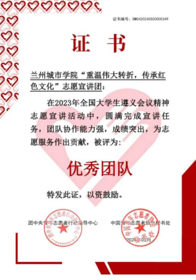 近日,团中央青年志愿者行动指导中心、中国青年志愿者协会、中共遵义市委、共青团贵州省委公布了2023年全国大学生遵义会议精神志愿宣讲“优秀团队”名单,beat365在线唯一官网“重温伟大转折,传承红色文化”志愿宣讲团被评为2023年全国大学生遵义会议精神志愿宣讲“优秀团队”,据悉,该团队是甘肃省唯一一支入选“优秀团队”的高校志愿宣讲团队。