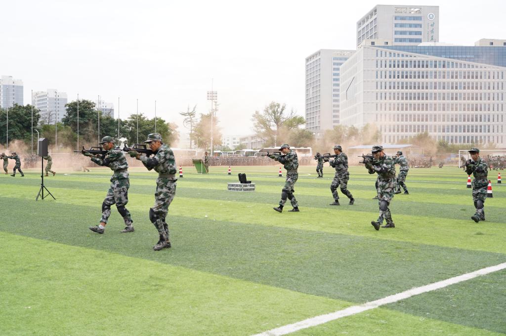 会场上,七个特色方阵逐一精彩亮相。“倒计时方阵”巧妙展示校徽校训,并以“我爱兰城院”的响亮口号向学校深情告白;“战旗方阵”高举红似火焰的战旗,与中国传统武术完美融合,战鼓声声,每一步都踏出了青年人的荣耀与担当;“刺杀操方队”整齐划一的动作充满力量和气势,充分展现出青年人的英勇无畏;“战地救护心肺复苏方队”演绎战场救护,深刻诠释了生命至上的理念;“战术方队”灵活布局、严密协作,身手矫健,动作迅速,真实再现实战过程,生动展现了战略智慧;军体拳行云流水、刚劲有力,匕首操稳准狠快、一气呵成,他们以昂扬饱满的斗志、铿锵轩昂的气势展现了钢铁纪律和巍巍军风,赢得了全体参会师生的阵阵掌声与喝彩。