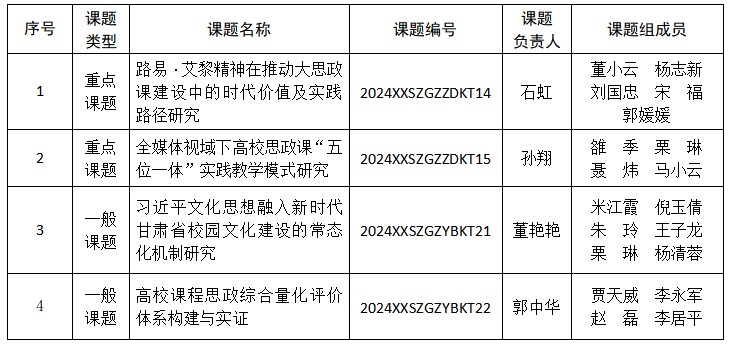2024年学校思想政治工作研究课题立项结果,beat3654项课题获准立项,其中重点项目2项、一般项目2项。详情见下表。