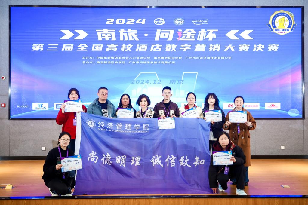 12月7日,由中国旅游饭店业协会人力资源分会、南京旅游职业学院、广州市问途信息技术有限公司共同主办的2024“南旅•问途杯”第三届全国高校酒店数字营销大赛在南京旅游职业学院圆满落幕。经济管理学院派出的两支代表队,均获得本科组二等奖,其中一支代表队获得大赛最佳传播奖。