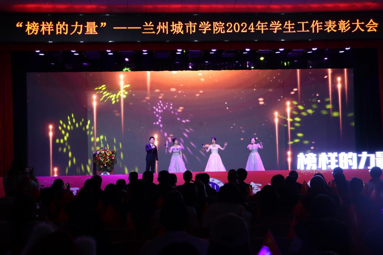 在与会师生诚挚、热烈的掌声中,获奖学生代表为特邀参会的“十佳班主任”代表和倾心陪伴、全力支持学生成长的家长代表们献上鲜花,表达了对学校、老师和家长的感恩、感谢,给大会增添了一抹温馨的色彩;音乐学院学生表演的舞蹈《希望的田野》开启了表彰之旅,师生联唱《熠熠的光》,全体辅导员朗诵诗歌《九月飞歌》,他们以饱满的热情和深情的演绎,向师生们传达了对未来的美好憧憬、坚定的理想信念和对教育事业的奉献与热爱;全体师生通过共同回顾了2024年学校学生工作的精彩瞬间,共同追寻奋斗的脚步、感受榜样的熠熠光辉。