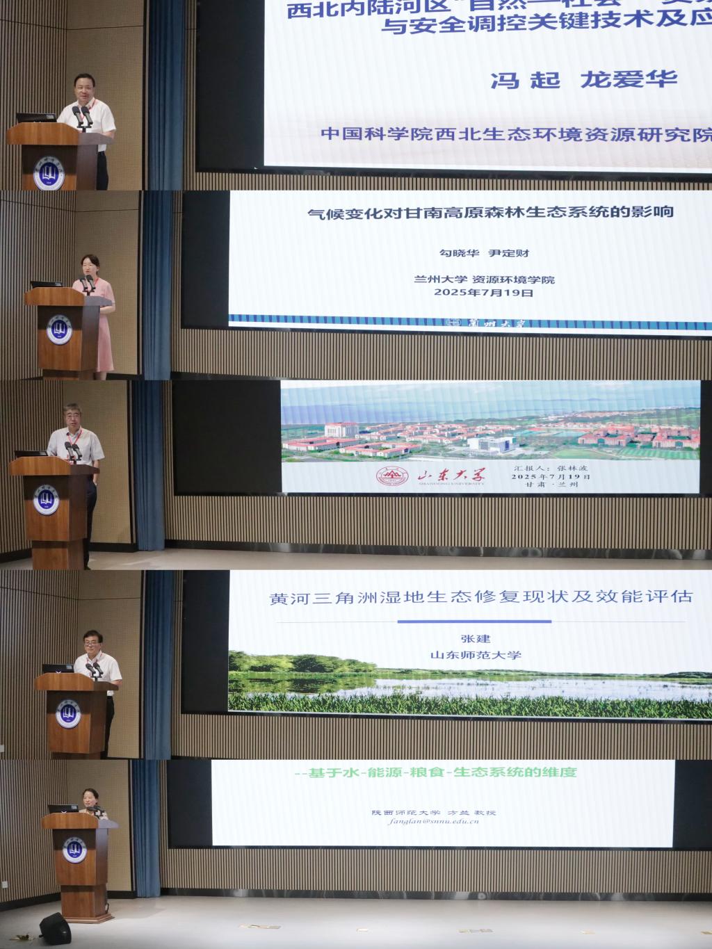 开幕式后的主旨报告环节,中国工程院院士、中国科学院西北生态环境资源研究院研究员冯起以《西北内陆河区“自然一社会—贸易”水循环理论与安全调控关键技术及应用研究》为题,系统阐述了其团队的重大理论创新与实践成果。兰州大学副校长勾晓华教授、山东大学张林波教授、山东师范大学校长张建教授、陕西师范大学方兰教授,分别围绕“气候变化对甘南高原森林生态系统的影响”“生态产品价值实现:超越国际生物多样性主流化的中国方案”“黄河三角洲湿地生态修复与效能评估”“全面推动黄河流域生态保护和高质量发展—基于水-能源-粮食-生态系统的维度”等核心议题作了精彩报告。