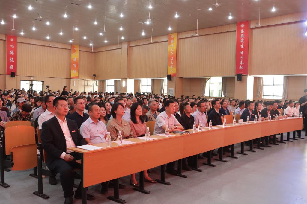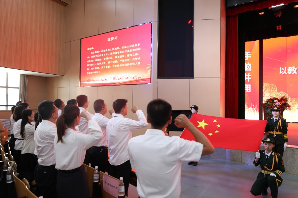 大会举行了2025年新教师入职仪式。新入职教师面向国旗,举起右手,庄严宣誓,表达投身教育事业、恪守教师职业准则的坚定决心。从教30年教师代表为新入职教师佩戴了校徽。