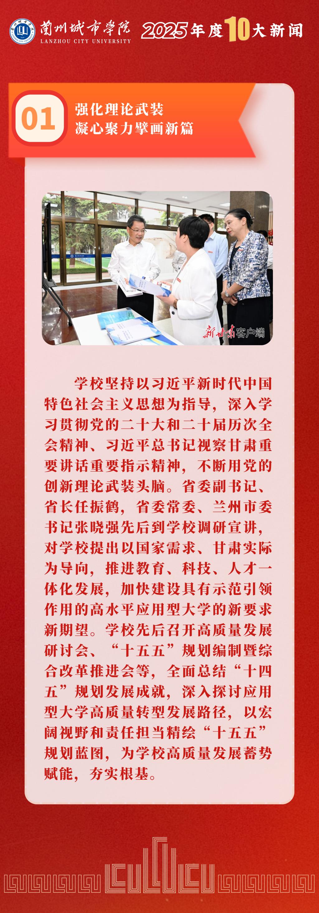 2025年是教育强国、教育强省建设全面布局、高位推进之年,是“十四五”规划收官和“十五五”规划谋划之年,也是学校建设高水平应用型大学,全力推进高质量发展九大工程的攻坚之年。这一年,学校坚持以习近平新时代中国特色社会主义思想为指导,深入学习贯彻落实党的二十大、二十届历次全会精神和习近平总书记视察甘肃重要讲话重要指示精神,扎实开展深入贯彻中央八项规定精神学习教育,全面落实全国全省教育大会和《教育强国建设规划纲要(2024—2035)》精神,主动融入国家发展战略和省委“五强”行动,持续深化“三抓三促”行动,以“高质量、高水平、高速度”发展为统领,系统谋划“十五五”事业发展规划,全面深化综合改革,各项事业均取得了令人振奋的成绩。