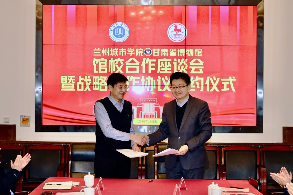 1月8日上午,学校与甘肃省博物馆战略合作协议签约仪式暨馆校合作座谈会在甘肃省博物馆举行。甘肃省博物馆党委书记白发武,党委委员、馆长班睿,党委委员、副馆长史册、张顺,校党委书记曹洁,党委副书记、校长韩高年,党委常委、副校长何玉红出席活动。签约仪式由白发武主持,双方相关职能部门、二级学院负责人参加活动。
