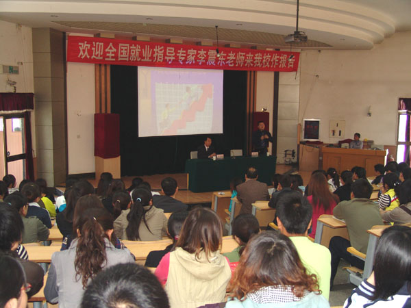 李震东老师首先分析了当前高校毕业生的就业形势。他认为虽然目前就业形势非常严峻,但对在座大学生而言,并非没有希望,而是机遇与挑战并存,关键是要做好选择,就是要在众多的工作中找到一份既符合自己状况又适合自己未来长远发展的工作,同时要在求职过程中做到方法的创新。接下来李老师以“职业生涯规划”为中心,以自己亲身经历就在校大学生如何做好职业生涯规划展开了详细的论述。他从哈佛大学对在校大学生的职业规划的研究为例,指出职业生涯规划对大学生未来发展有至关重要的意义,大学生应在大学学习期间早作规划,并且要做出正确的规划。他认为正确的职业生涯规划应建立于对自身优势和劣势及别人对自己评价的正确认识的基础之上,对在座大学生而言,正确的职业规划应是找到一个与自己性格、情趣、喜好相一致并且具有发展潜力工作,并指出职业生涯规划中应注意的几个问题。讲座结束后,李老师和在座学生进行了互动交流。