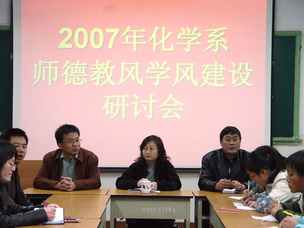 10月29日晚,化学系在理科楼1204教室召开了师风、师德、学风建设研讨会。系党政领导、各教研室主任、教师代表,以及各班学习委员和学生代表60多人参加了会议。与会人员就化学系教学工作和学风建设取得的经验和存在的不足进行了广泛的讨论,整个会场讨论热烈,气氛和谐。学生们也给系上的教学工作提出了很多建议,在座的老师也针对学生提出的问题给予了解答,并指出“学习要有科学的方法”,“要充分发挥自身学习的主观能动性”,“要认真配合好教师的课堂教学”。