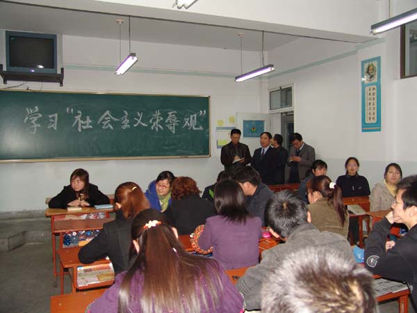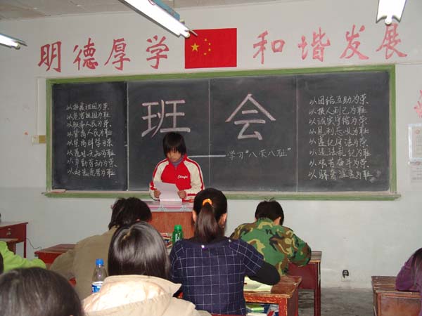 同学们在认真开展以学习“八荣八耻”为主要内容的社会主义荣辱观。