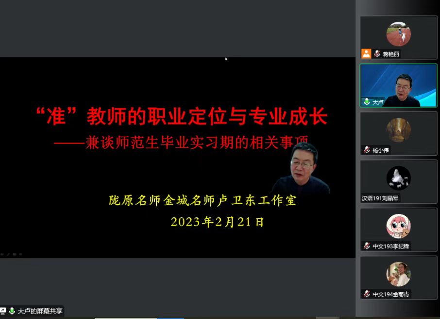 陇原名师、“卢卫东语文名师工作室”领衔导师、兰州市六十四中副校长卢卫东作了题为《准教师的职业定位与专业成长——兼谈师范生毕业实习期的相关事项》的专题讲座。讲座从新教师的职业定位、职业定位决定专业发展、新教师的专业成长三个方面对学生进行了职业认同和专业规划教育。他结合名师、名班主任的成长案例,提出读书和反思是教师专业成长的有效途径,能有效促进教师的学科专业提升与发展。