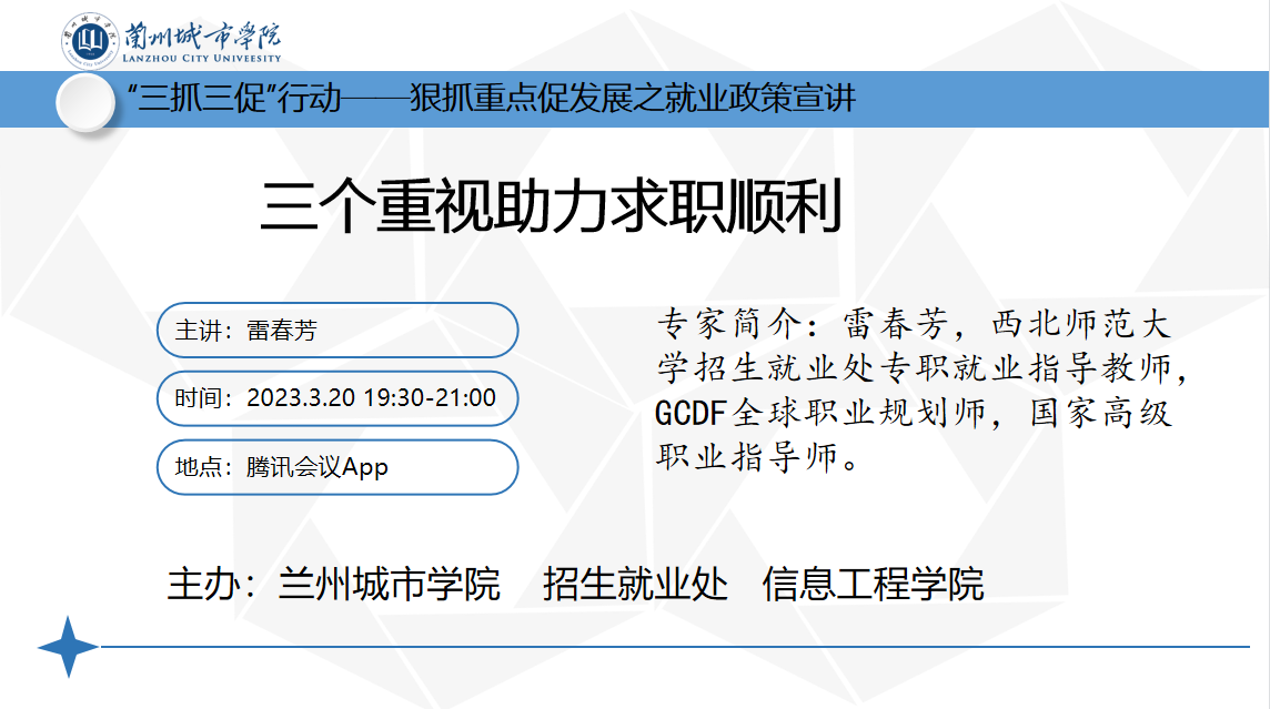 为更好地推动2023届毕业生就业工作,引导毕业生树立正确的就业观和择业观,3月20日,招生就业处、信息工程学院联合举办“‘三个重视’助力求职顺利”主题讲座。讲座邀请西北师范大学招生就业处专职就业指导教师、GCDF全球职业规划师、国家高级职业指导师雷春芳为主讲嘉宾。
