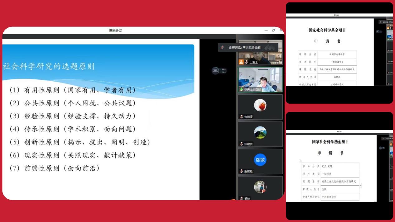 会上,李天龙结合国家社科项目评阅经验和申报经验,从题目拟定、研究兴趣、学术积累、撰写规范等角度阐述了国家社科基金项目申报中的注意事项,并对拟申报项目申报书逐一进行点评,对申报题目、研究问题、研究价值、研究计划、表述格式等方面提出了修改意见和建议。