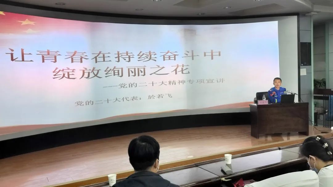 於若飞从历史性的时刻彰显国之风范、团结奋斗赢得历史性胜利、以中国式现代化全面推进中华民族伟大复兴、全面建设社会主义现代化国家、让青春在全面建设社会主义现代化国家的火热实践中绽放绚丽之花等五个方面全面详实的讲解了党的二十大报告内容,并重点讲述了党的二十大报告中关于青年工作的重要论述部分。於若飞鼓励广大青年干部要做到听党话,跟党走,树立崇高理想信念,用党的科学理论武装自己,不断学习练就过硬本领,让青春在持续奋斗中绽放绚丽之花。