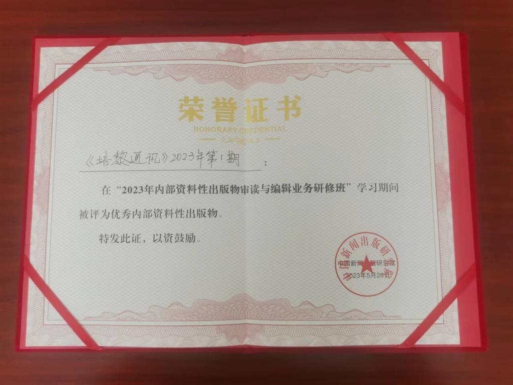 近日,由中国新闻出版研究院举办的“2023年内部资料性出版物审读与编辑业务研修班”开展了2023年优秀内部资料性出版物评选活动并举行了颁证仪式,由beat365主办、路易·艾黎研究中心负责编辑的《培黎通讯》2023年第1期被评为优秀内部资料性出版物。