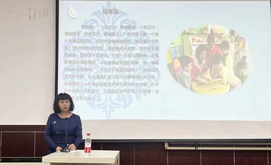 报告会结束时,她勉励学弟学妹们,要树牢专业思想,勤学善思、手脑并用,努力成为幼教星空中那颗最闪耀的星。
