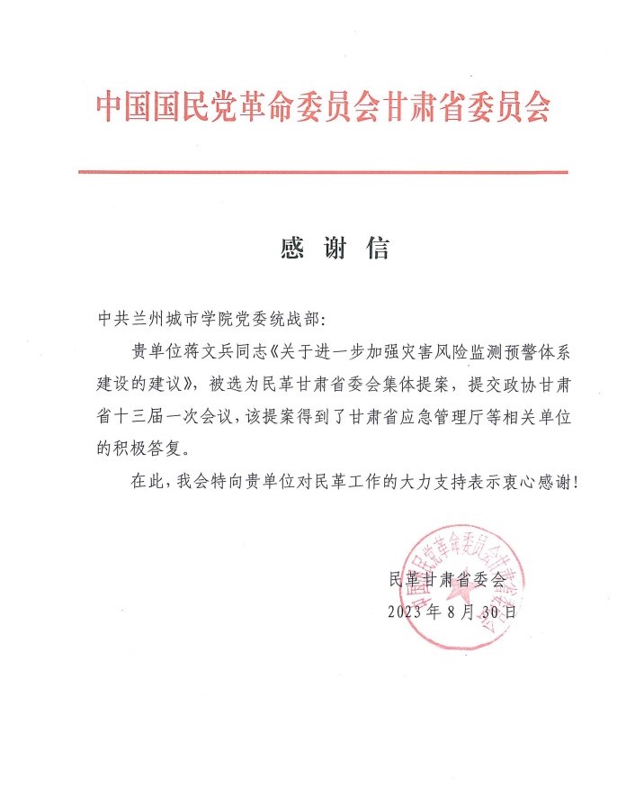 蒋文兵此次的提案为民革参政议政工作贡献了自己的智慧和力量,民革甘肃省委给学校发来感谢函,对学校大力支持民主党派成员建言献策表示衷心感谢。