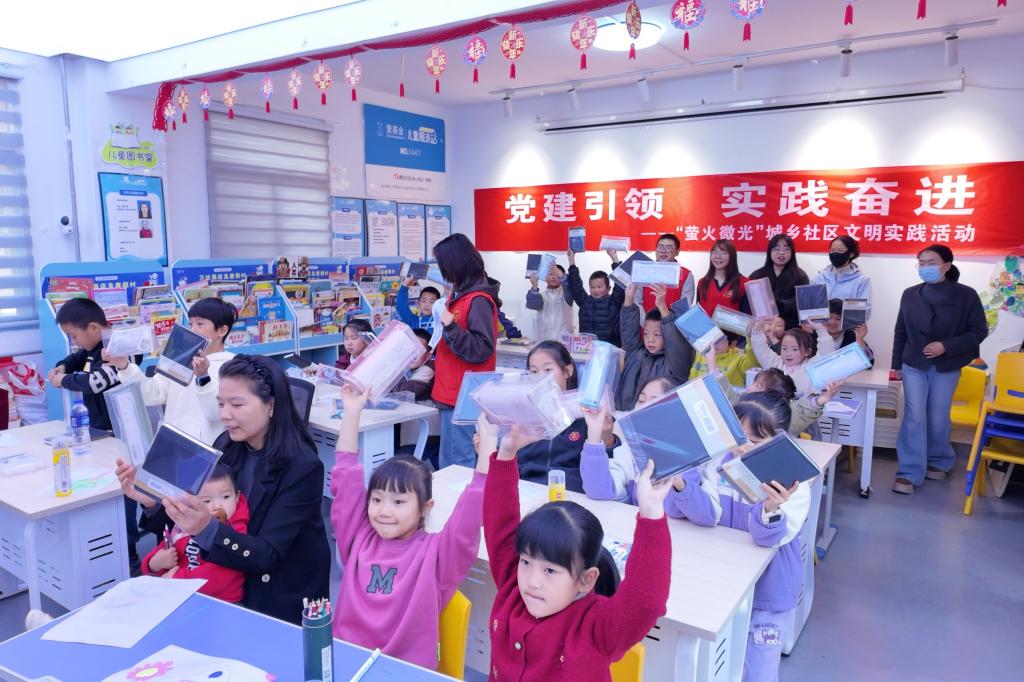 活动通过心理团辅破冰游戏、主题心理团辅、安全教育实景模拟等环节,发挥应用心理学专业优势,帮助社区儿童提升人际交往能力与安全意识。在志愿者引导下,孩子们参与了“桃花朵朵开”“水到渠成”等团队协作游戏,以及“微笑接力”“共绘友情画”等主题互动,在轻松氛围中学习表达、倾听与合作。活动还开展了防溺水、防走失等实景模拟教育,增强儿童自我保护意识。活动中,学生党支部负责人与志愿者还为孩子们发放笔袋、笔记本等学习用品,鼓励他们努力学习、健康成长。