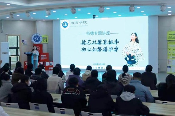 为深入学习贯彻习近平总书记关于师德师风建设的重要论述,弘扬践行教育家精神,10月31日,教育学院举办2025年“师德大讲堂”宣讲活动,邀请学校师德先进个人获得者、教育学院蔡兆梅教授、胡学文副教授作专题报告。教育学院师生代表参加活动。
