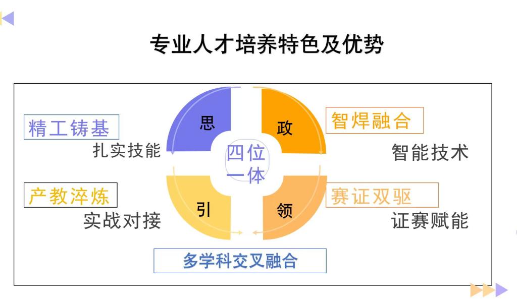 传承路易・艾黎精神,恪守“手脑并用,创造分析”校训,以立德树人为根本,融入AI赋能的新质生产力创新体系,构建多学科交叉融合的人才培养模式,形成“精工铸基(扎实技能)+智焊融合(智能技术)+产教淬炼(实战对接)+赛证双驱(证赛赋能)”四位一体专业特色。