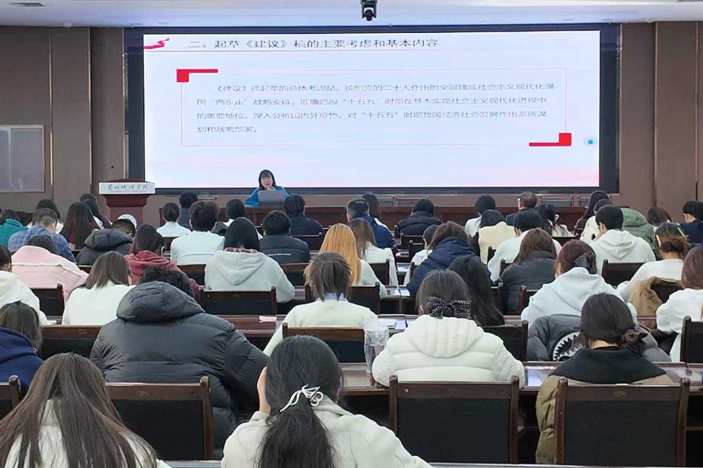 刘姌以“深刻领会中国式现代化的战略擘画—学习贯彻党的二十届四中全会精神”为主题,对全会精神进行了全面系统的解读。她从时代背景、核心要义、战略考量三个维度阐释了《中共中央关于制定国民经济和社会发展第十五个五年规划的建议》起草过程和重要意义。通过详实数据和案例,她展示了“十四五”期间我国发展取得的重大成就,并结合中国式现代化的本质要求,对“十五五”时期经济社会发展的指导思想、基本原则、主要目标和重点任务进行了深入讲解。