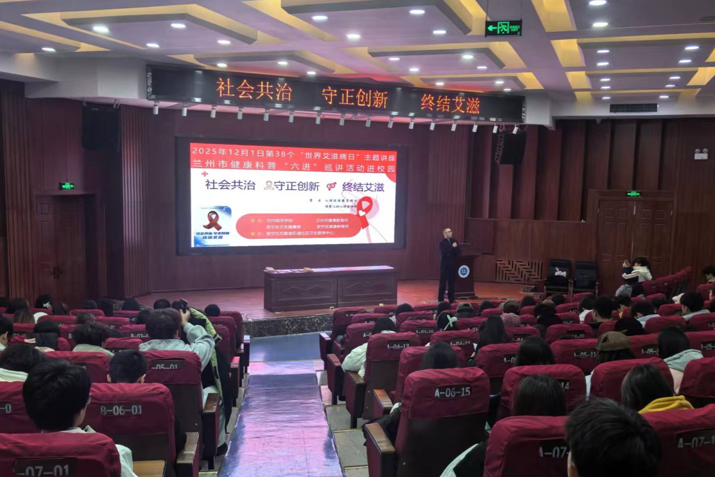 11月27日下午,校本部举办“预防艾滋病知识”专题讲座。兰州市健康科普宣讲团专家曹凌系统讲解了艾滋病的基本知识、传播途径、预防措施及检测治疗等内容,引导学生树立健康第一责任人意识,培养文明生活方式。