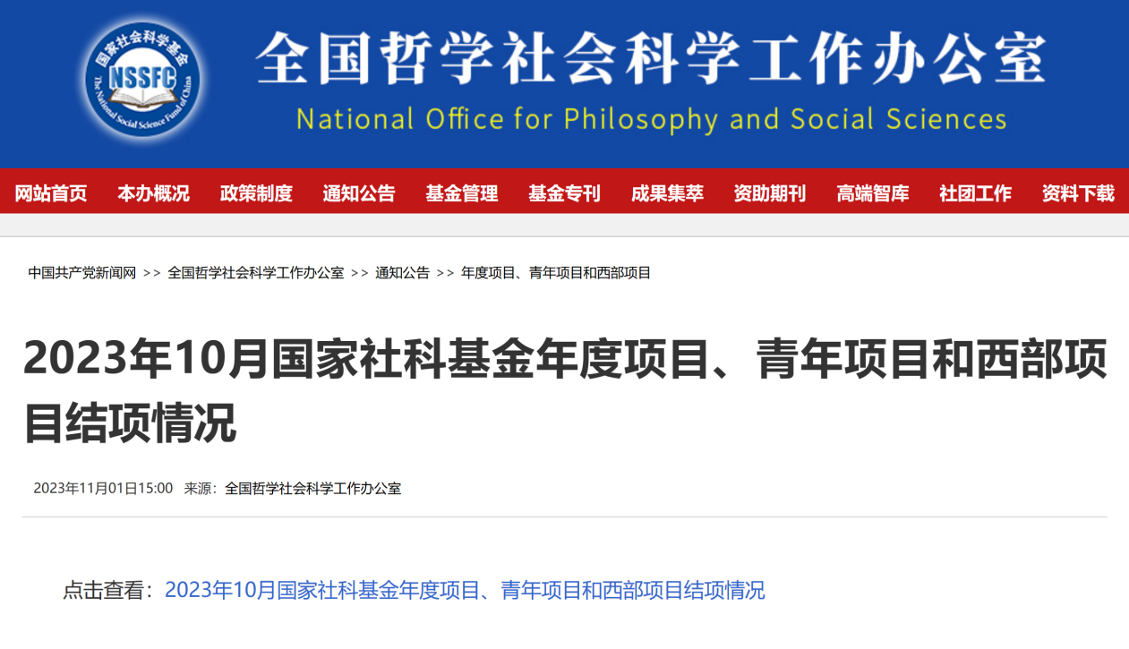 据悉,国家社科基金项目对成果质量要求高,申报竞争激烈,结项审核严格。2023年10月共验收项目555项,31项获“优秀”等级,优秀率为5.59%。