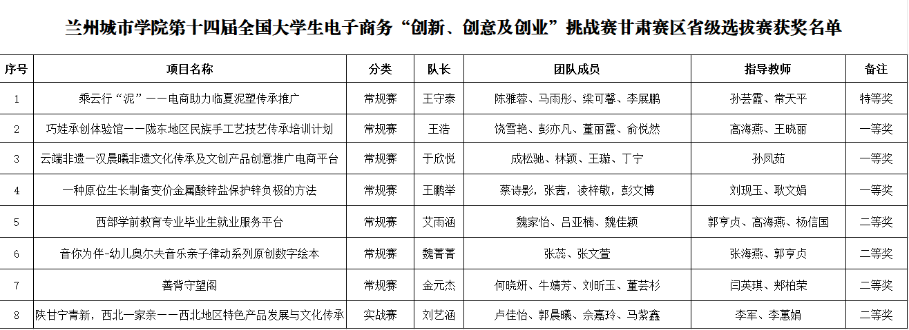 近日,由省教育厅主办、兰州财经大学承办的第十四届全国大学生电子商务“创新、创意及创业”挑战赛甘肃赛区省级选拔赛落下帷幕。beat365获得省级特等奖1项、一等奖3项、二等奖4项;孙芸霞、常天平2位教师荣获最佳指导教师奖,刘现玉、耿文娟 、孙凤茹 、高海燕、王晓丽5位教师荣获优秀指导教师奖,beat365荣获优秀组织奖。其中2个项目团队成功晋级国赛。
