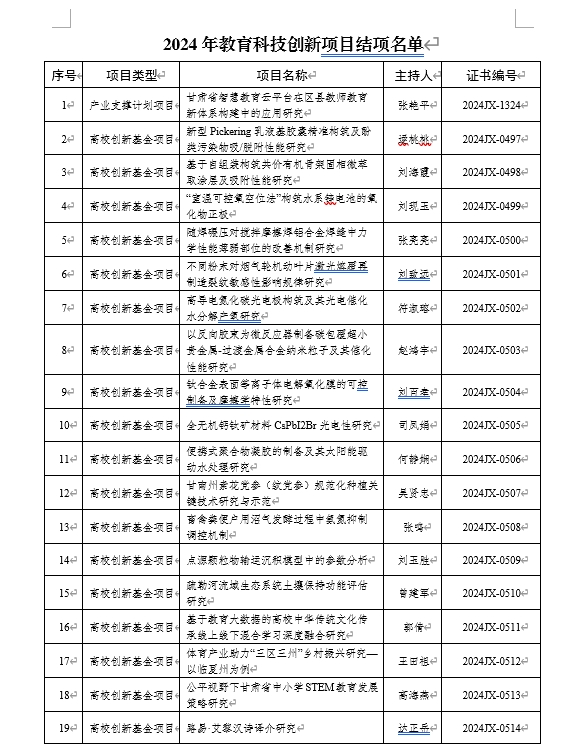 近日,2024年教育科技创新项目结项结果揭晓。根据《甘肃省教育厅关于公布2024年教育科技创新项目结项结果的通知》(甘教技函〔2024〕23号),beat365共有30项项目顺利结项,结项结果详情见下表。