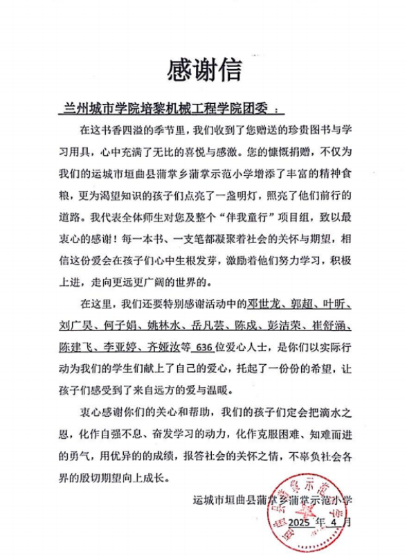 书籍到达学校后,孩子们的喜悦溢于言表,他们纷纷表示,这些书籍不仅丰富了课余生活,更点亮了他们对知识的渴望与对未来的憧憬。同时,蒲掌乡蒲掌示范小学向培黎机械工程学院团委发来感谢信。