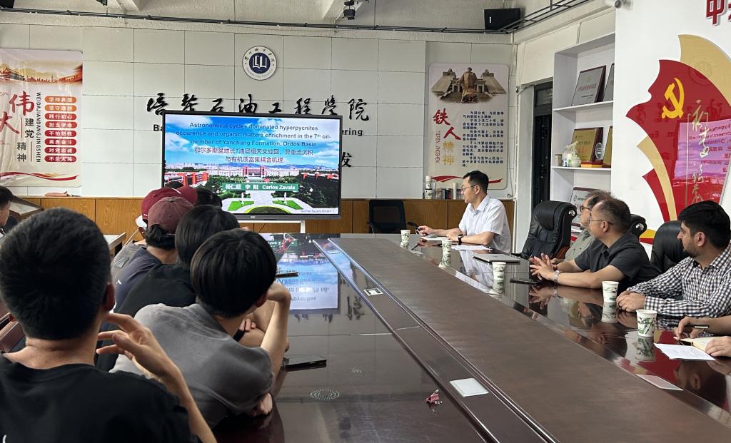 杨仁超以《鄂尔多斯盆地长7油层组天文旋回、异重流沉积与有机质富集耦合机理》为题作学术报告,分享了其研究团队的最新成果。团队基于自然伽马、磁化率及元素等关键数据的深入分析,清晰识别出鄂尔多斯盆地长7油层组中的米兰科维奇旋回,成功建立了该地层拉丁阶至卡尼阶的高精度天文年代标尺,并指出该时期沉积速率较低的特征。报告内容前沿、逻辑严谨,引发了在场师生的浓厚兴趣。互动环节中,师生们围绕“天文旋回识别方法” “有机质富集控制因素”等核心科学问题踊跃提问,杨仁超结合自身研究积累,进行了详尽而深入的解答。