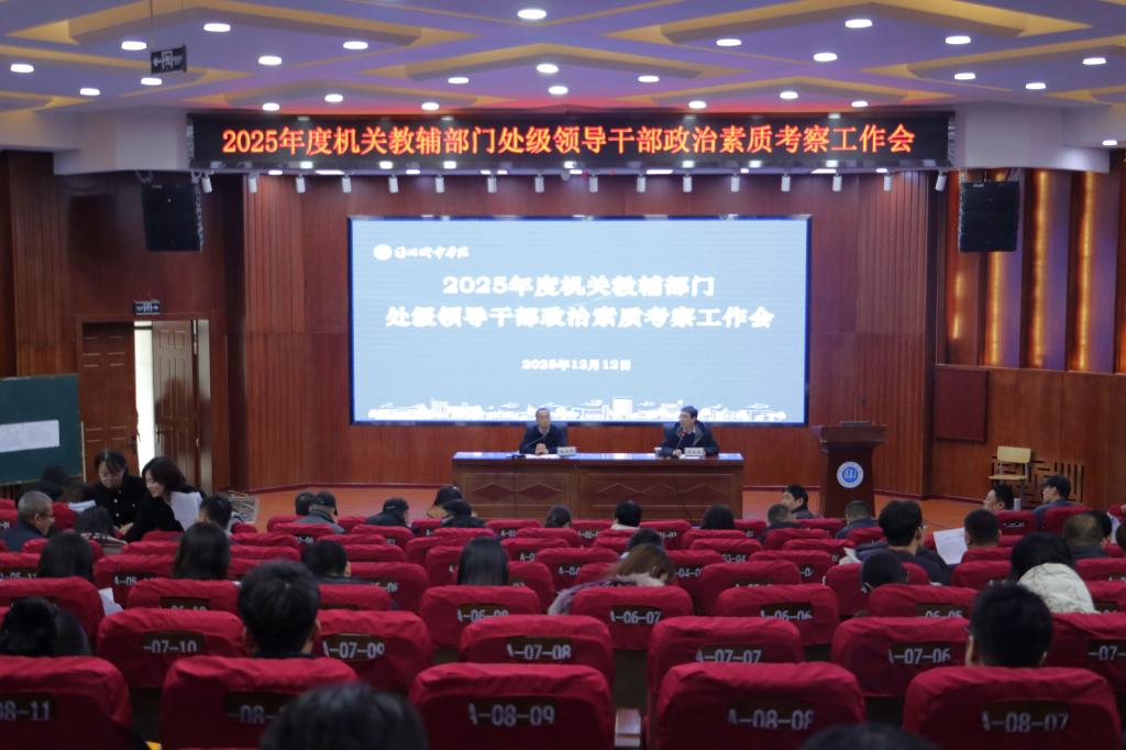 12月12日下午,2025年度机关教辅部门处科级干部年终考核测评会、处级领导干部政治素质考察工作会及机关党委党支部书记抓党建述职评议考核工作会在校本部大学生活动中心一楼召开。校党委副书记牟录贵出席会议,机关教辅各部门及机关党委全体党员参加会议。