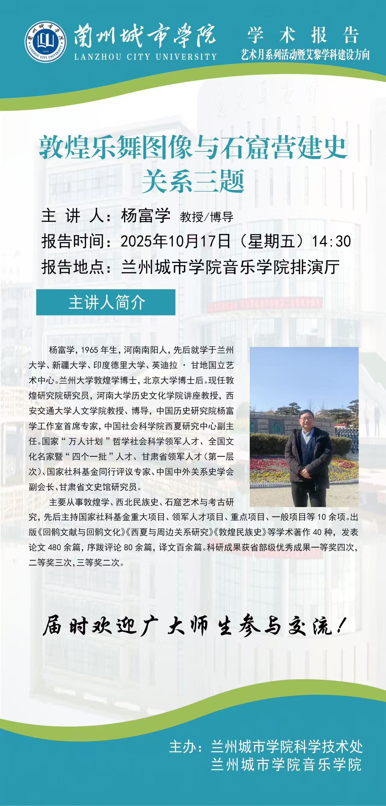 应科学技术处、音乐学院联合邀请敦煌研究院、西安交通大学人文学院教授、博导,中国历史研究院杨富学工作室首席专家、杨富学研究员来beat365作学术讲座